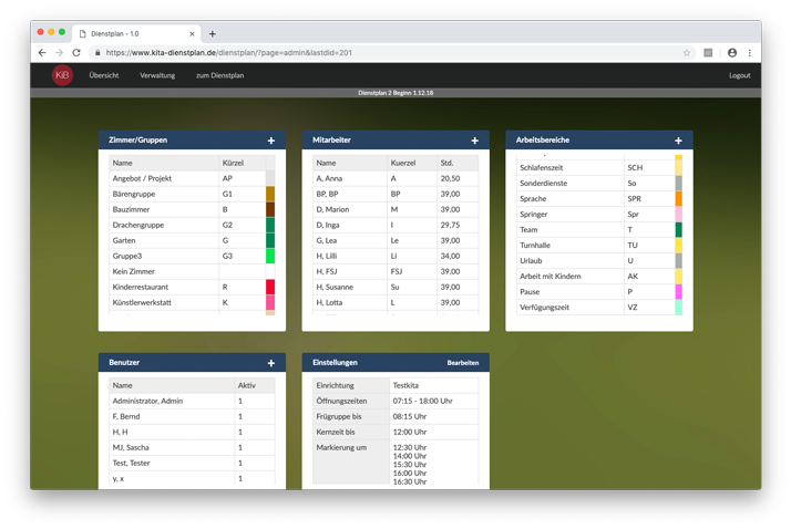 Kita im Blick kann komplett auf Ihre Kita zugeschnitten werden. Öffnungszeiten, Gruppen, Zimmer und Arbeitsbereiche können Sie frei festlegen und farblich markieren.