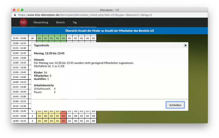 Da der Fachkräfte-Kind-Schlüssel variieren kann, können Sie auch Teilbereiche überprüfen. Wenn zu wenig Fachkräfte für einen Zeitpunkt eingeplant sind, bekommen Sie entsprechende Hinweise.